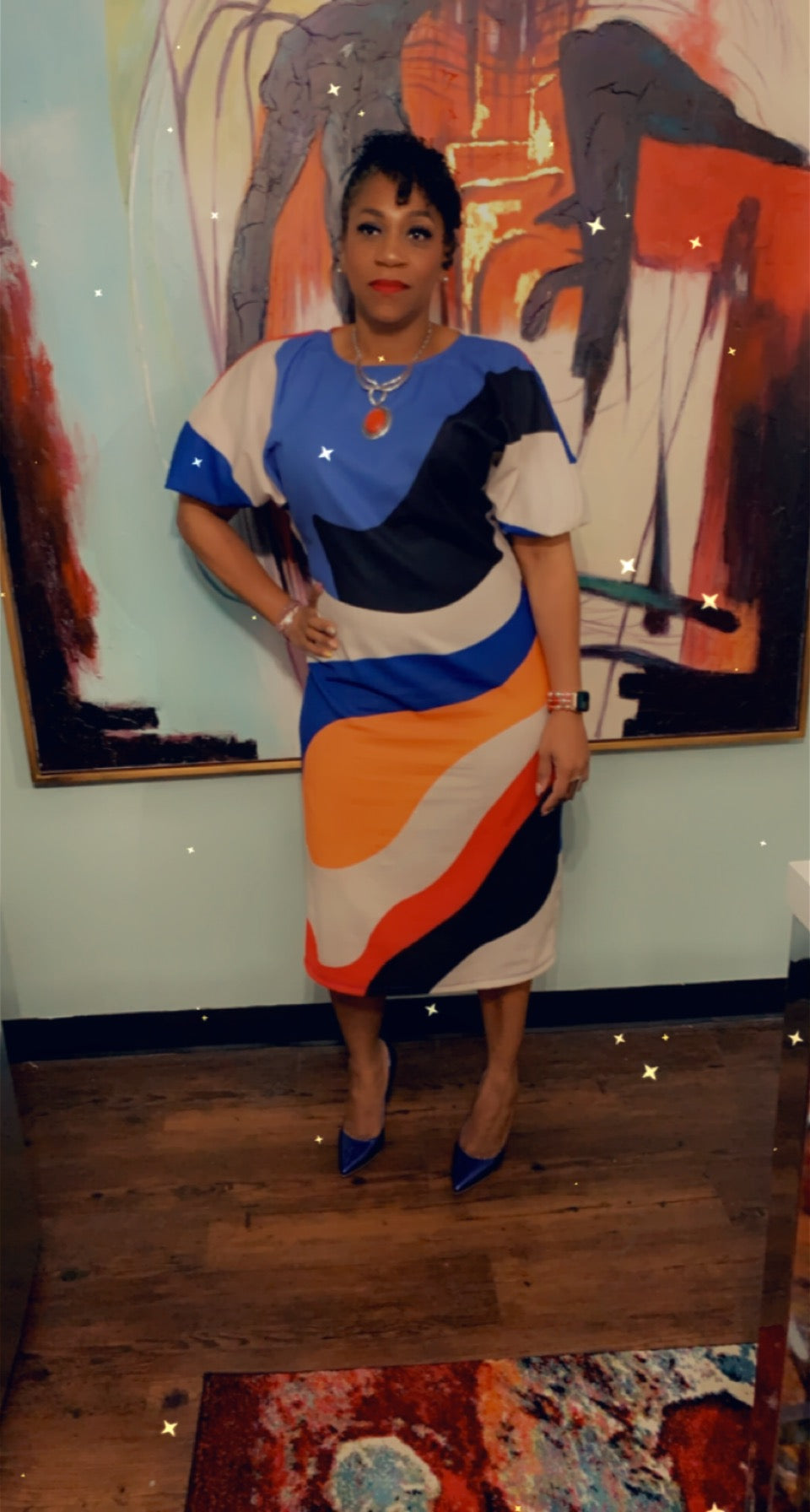 Textured, Color Block Print, Round Neck, Bubble Half Sleeve, Body-Con Midi Dress with Complimentary Face Mask.