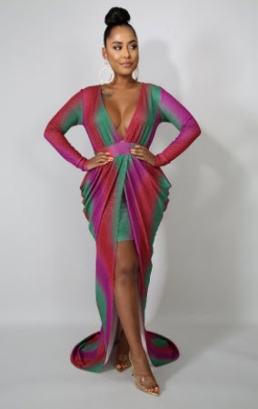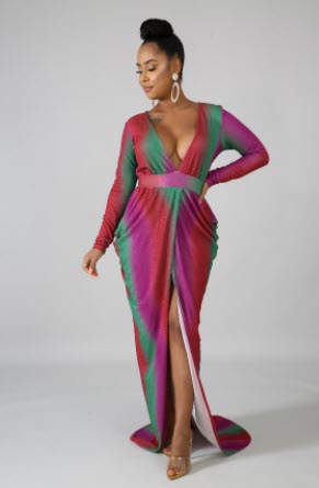 This maxi dress features, a stretchy fabric, v-neckline long sleeves, underlined, skirt, no closures